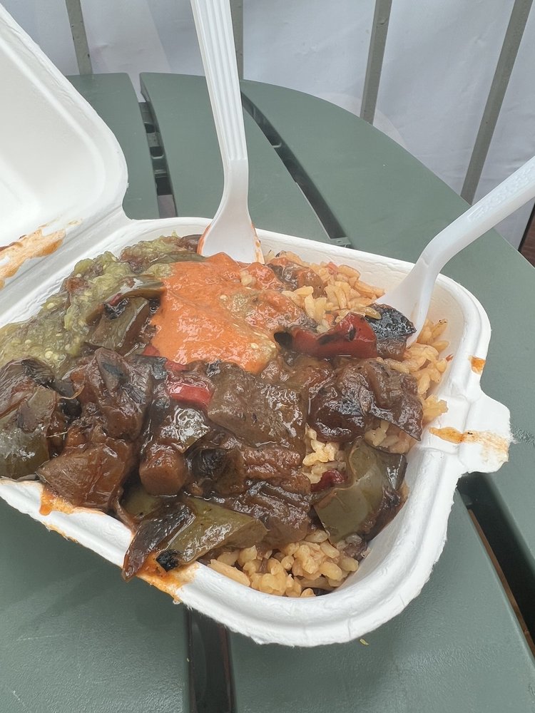 “ I had Mi Casa at their Farmer's Market stand, so I can't really speak to their ambiance, but the food itself was amazing! Very flavorful, and perfect portion size. The chipotle sauce was really really tasty, and had a nice kick. I got the stewed eggplant over rice and peas and loved it. The woman who was working the stand was also really nice and quick service. ”